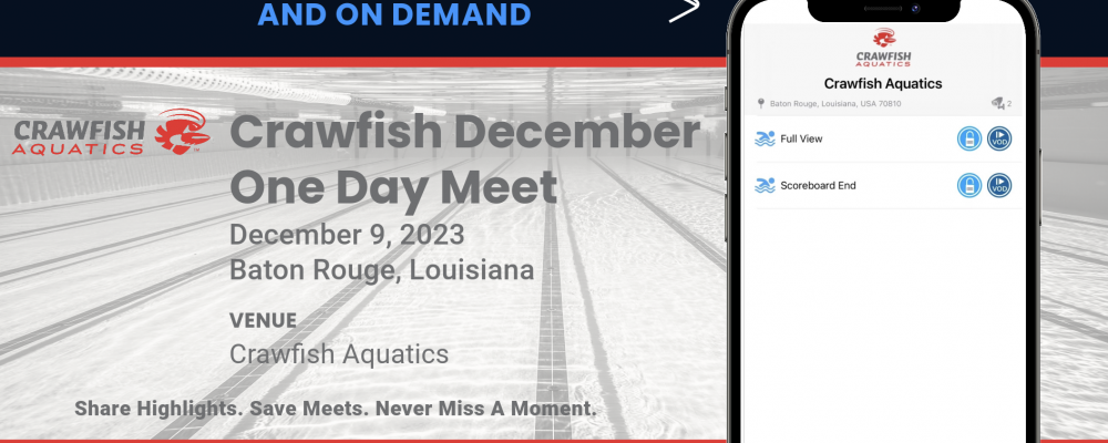 -Swim Caps must be the black Crawfish Aquatics swim cap. These are available at the Info Booth (there will be designated purchase days announced ahead of the meet).